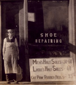 We lived in Asheville for a short time. We left Asheville while I was very young, just a baby. Our father had worked for the railroad and part-time for the telephone company. Just what the telephone company was like at that time or how far it had advanced I do not know. Anyway they hired my father to go to Alabama with the company. We lived in Cullman for how long I do not know. We went David Simeon "Simmie" Butner in front of his shoe repair shop, Birmingham, Alabama, about 1914. The first toy I remember playing with was there. A little neighbor boy about my age, Charles Copeland, and I were playing on the front steps of my uncle’s house when one of us (I don’t know which) found a silver dollar under the steps. I had