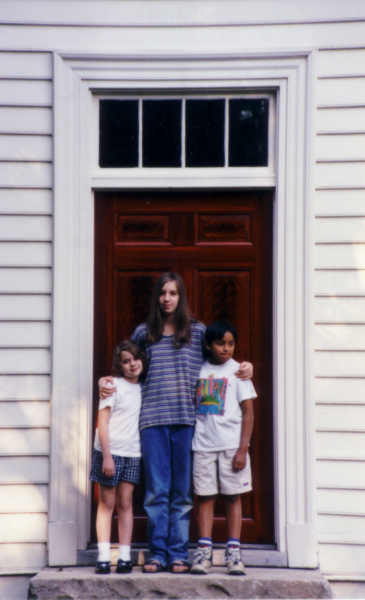 Anna-Laura, Emily, and Matthew Tarpley, great-great-great grandchildren of Frederick Binkley and Adeline Shackleford, stand in the doorway of Travellers Rest, 1997.
